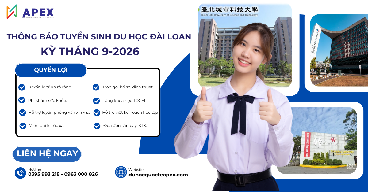 Du Học Apex là đơn vị uy tín chuyên cung cấp các gói dịch vụ, hỗ trợ apply du học Đài Loan, bao gồm đa dạng học bổng, chương trình và hệ đào tạo tại các trường đại học uy tín của Đài Loan