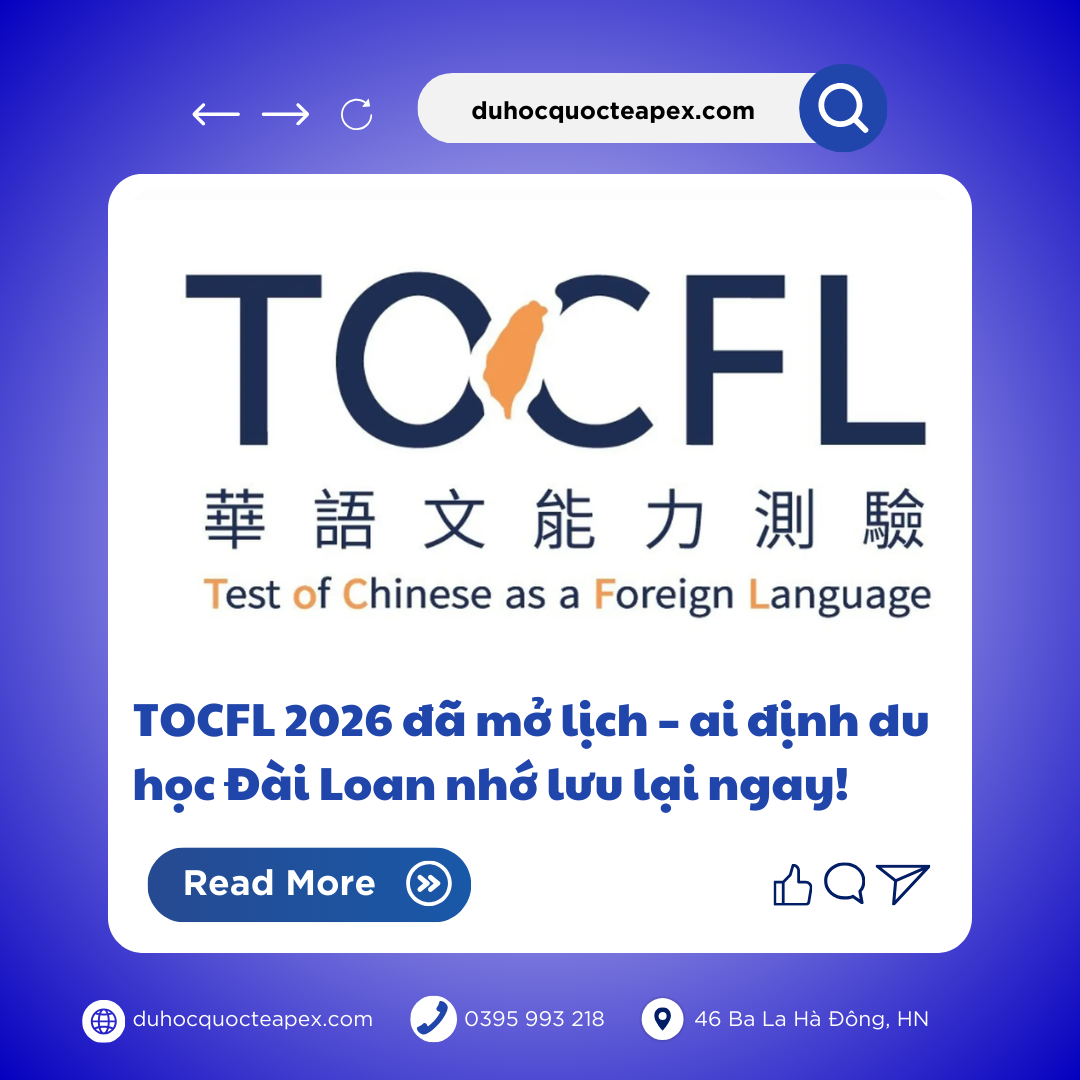 Lịch thi TOCFL 2026 tại Hà Nội là cơ hội vàng để bạn chinh phục giấc mơ Đài Loan. Với lệ phí hợp lý, đăng ký dễ dàng và địa điểm tiện lợi tại Phòng Giáo dục Văn phòng KT&VH Đài Bắc hoặc liên hệ ngày với Apex để nhận lộ trình hợp lí nhất,đừng chần chừ!