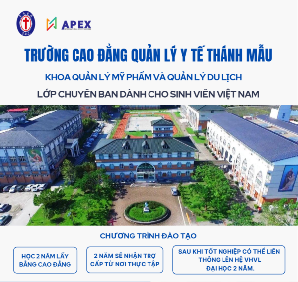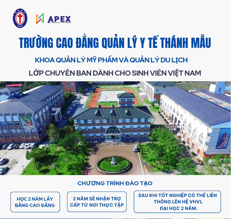 Nằm nép mình tại thành phố Yilan – vùng đất thiên đường với suối nước nóng ấm áp và rừng quốc gia xanh mướt của Đài Loan – Trường Cao đẳng Quản lý Y tế Thánh Mẫu (St. Mary’s Junior College of Medicine, Nursing and Management) chính là biểu tượng của sự kết hợp hoàn hảo giữa truyền thống và hiện đại. Được thành lập với sứ mệnh nuôi dưỡng những chuyên gia y tế, quản lý tài năng hàng đầu châu Á, trường tự hào sở hữu môi trường học tập đa văn hóa sôi động, nơi sinh viên quốc tế từ Việt Nam, Indonesia đến Philippines cùng chia sẻ đam mê và khám phá bản thân. Với cơ sở vật chất tiên tiến và vị trí lý tưởng gần thiên nhiên, trường không chỉ trao tặng kiến thức chất lượng cao mà còn mang đến sự cân bằng lý tưởng giữa học tập chuyên sâu và những khoảnh khắc thư giãn đầy cảm hứng, giúp bạn phát triển toàn diện cả về trí tuệ lẫn tinh thần.