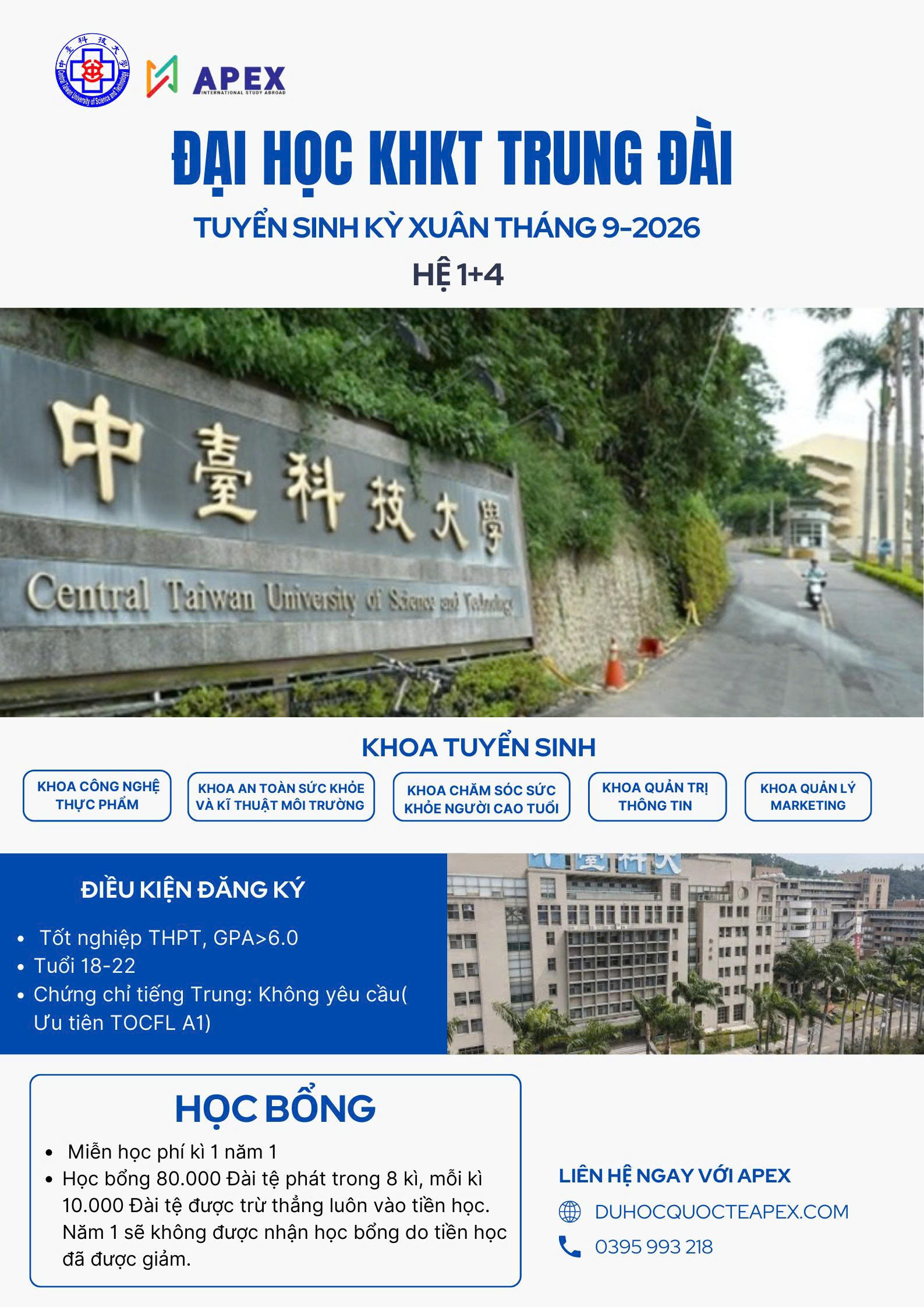 Đại học Khoa học Kỹ thuật Trung Đài là một trong những cơ sở đào tạo uy tín tại Đài Loan, định hướng phát triển theo mô hình đại học ứng dụng, chú trọng đào tạo gắn liền với nhu cầu thực tiễn của xã hội và doanh nghiệp. Nhà trường tập trung vào các lĩnh vực mũi nhọn như công nghệ, quản trị, môi trường và chăm sóc sức khỏe – những ngành nghề đang có nhu cầu nhân lực cao tại Đài Loan cũng như nhiều quốc gia trong khu vực.